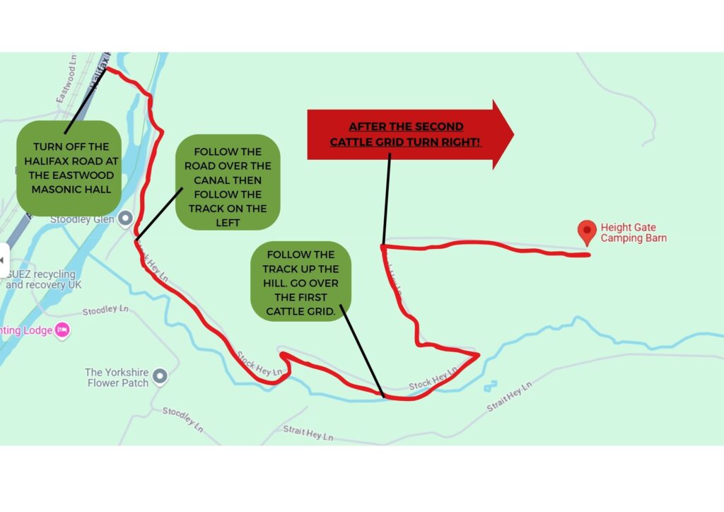 Turn off the A646 at Stoodley Glen, follow the road over the bridge that goes across the canal. Follow the road until you get to the houses, from there take the track on the left instead of following the road to the houses. When coming up the track go straight over the first cattle grid. When you get to second cattle go over it and immediately take the right hand fork in the lane. Do not enter the large stone gates with ‘Height Farm’ on. Keep right and please continue down the track until the end and Height Gate camping Barn will be on your left.
